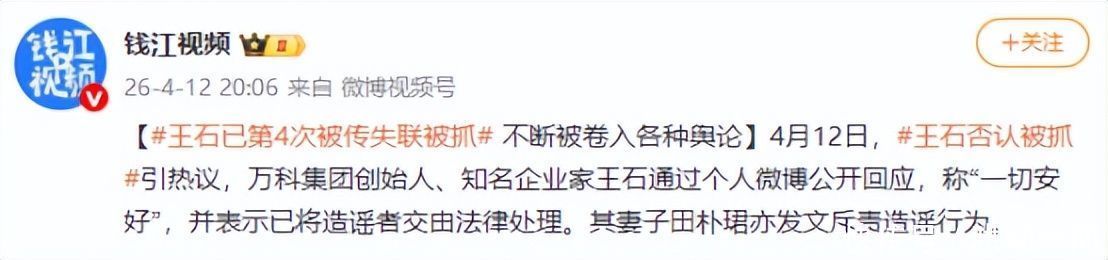 部分参考资料:王石已第4次被传失联被抓 不断被卷入各种舆论——钱江视频王石田朴珺夫妇回应“被抓”传闻:一切安好,造谣者交给法律——红星新闻回应被抓传闻!王石发文称造谣者交给法律,今年初传出与田朴珺离婚消息,被二人辟谣,但二人目前无商业关联——金融界