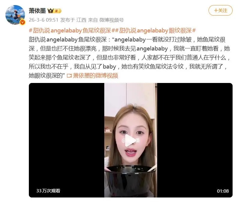 3月6日,据网友爆料,网红甜仇在直播中的一番言论,使Angelababy的鱼尾纹意外成为话题焦点。她直言不讳地说:“Angelababy一看就没打过除皱,她鱼尾纹很深,但是也拦不住她很漂亮。”这番看似“拆台”的表述,却意外引发了一场关于真实美感与容貌焦虑的全网讨论。